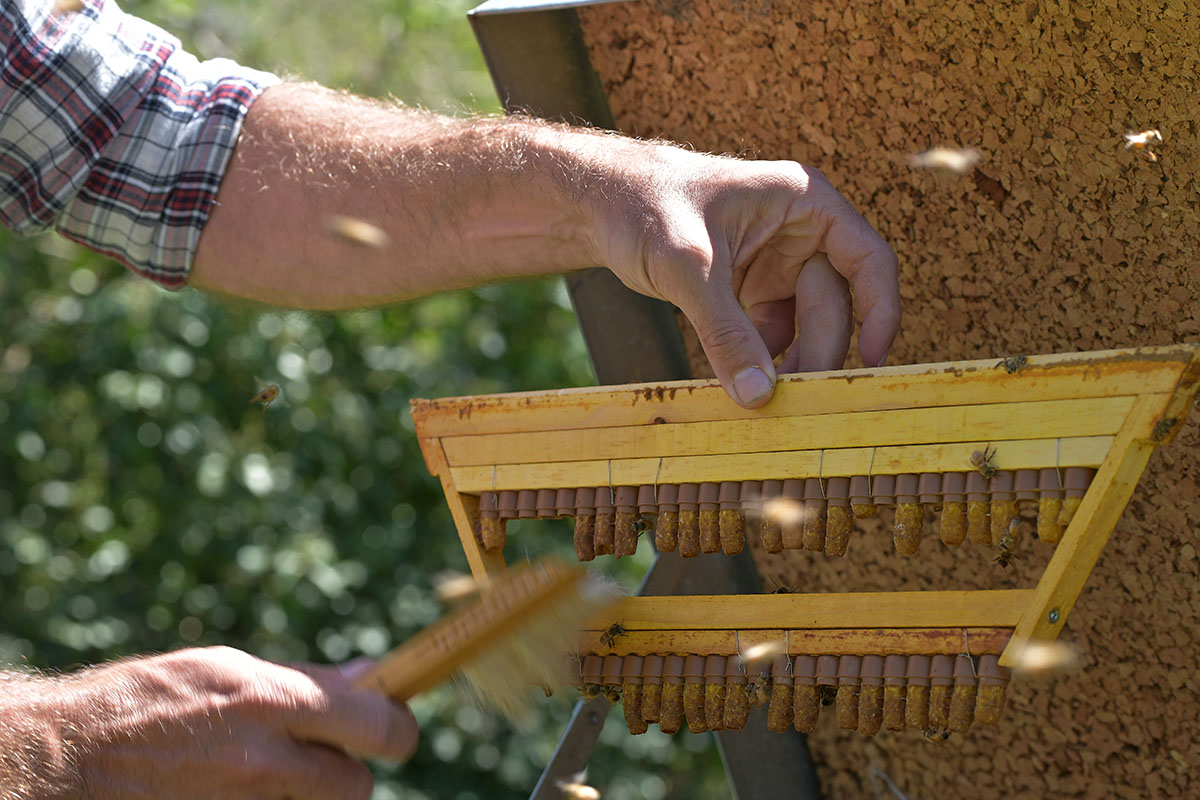 L’apiculteur intervient ensuite avec le greffage : un geste d’une extrême minutie consistant à transférer de minuscules larves dans des cupules royales. Ce travail demande une parfaite maîtrise, une main sûre et un œil exercé, tant les larves sont fragiles.